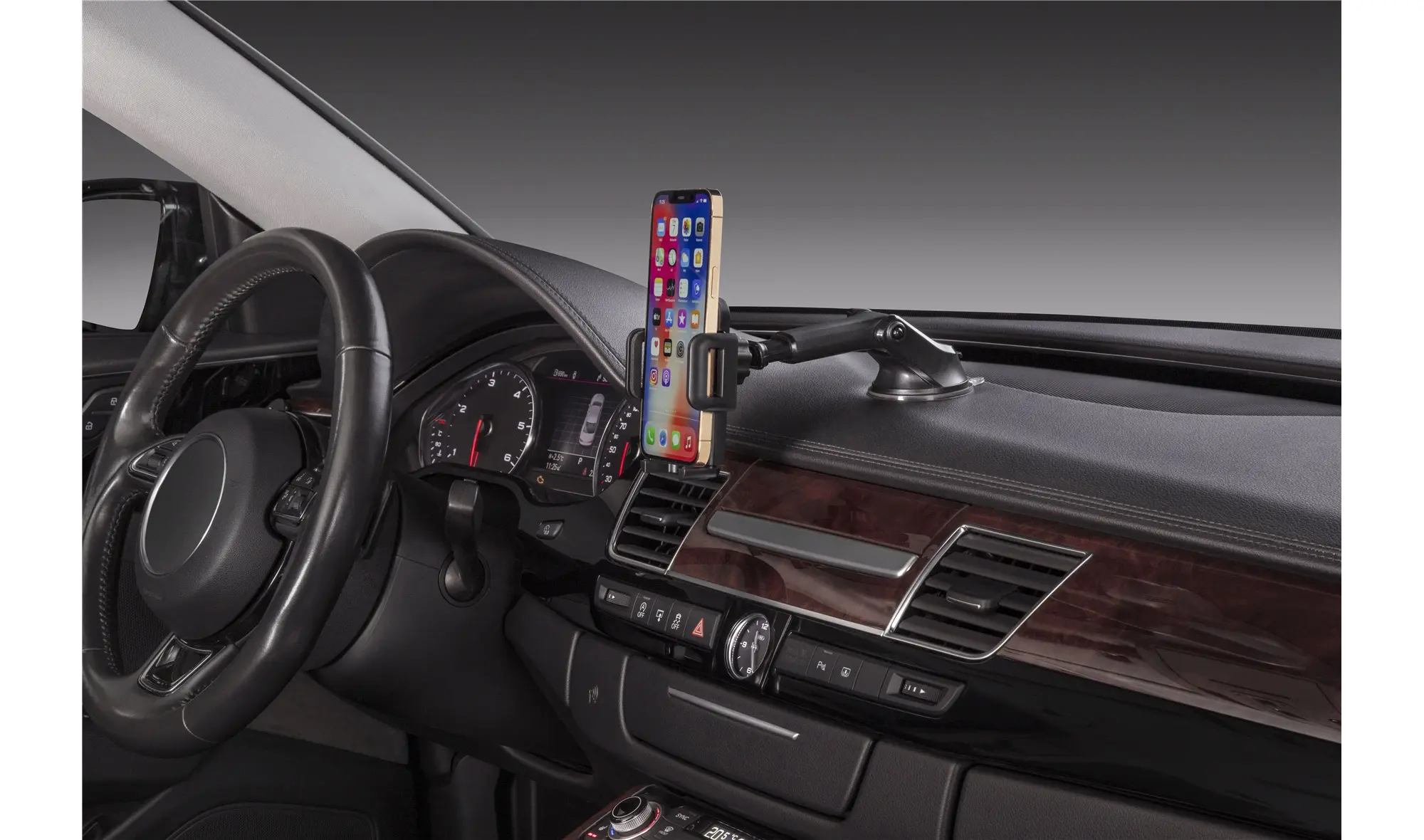 Du kan let betjene din telefon, når holderen er placeret på instrumentbrættet eller på ruden. Den er desuden med justerbar arm, så du kan placere holderen på den afstand, du ønsker.